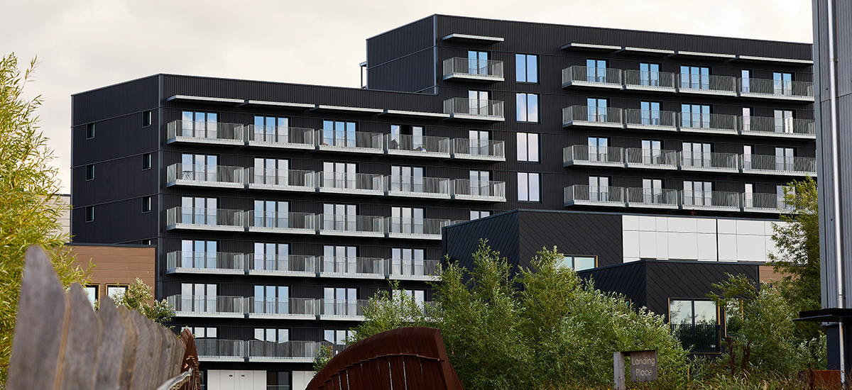 Der „Climate Innovation District“ wurde von Citu in Zusammenarbeit mit einem der führenden Architekturbüros Skandinaviens, White Arkitekter, sowie den Bau- und Tragwerksplanern Civic entwickelt. Das Projekt steigert nicht nur das Angebot an hochwertigem städtischem Wohnraum, sondern schafft ein vollständig neues nachhaltiges Stadtviertel. Es wurden über 500 Niedrigenergie-Wohnungen geschaffen, deren Design mit dem PHPP (Passive House Planning Package) bewertet wurde. Zwei Wohngebäude des Projekts, die „Aire und District Lofts“, auch als „Volumina“ bezeichnet, bestehen aus einer primären Stahlkonstruktion mit integriertem Stahlrahmensystem. Dies ermöglicht einen konstruktiven Aufbau einer VHF, welche mit zwei verschiedenen Swisspearl-Faserzementprodukten an der Außenseite bekleidet wurde. Jedes der „Volumina“, „Aire und District Lofts“, ist ein mehrgeschossiges Wohngebäude mit bis zu zehn Etagen und bietet verschiedene Wohnungstypen und -größen.CROSSFIX® wurde als Unterkonstruktion ausgewählt, da es den Bau einer hochgedämmten Fassade ermöglichte, ohne die ästhetische Gestaltung zu beeinträchtigen, und gleichzeitig eine einfache Montage bot.